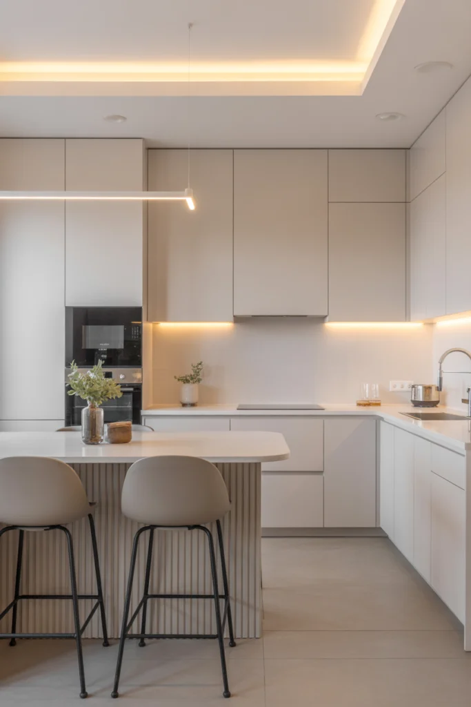 This approach to House Kitchen Ideas is perfect for anyone wanting a serene environment where design and practicality blend seamlessly. Pairing minimal décor with high-quality materials such as quartz, textured stone, or warm wood accents can add just the right touch of character. Lighting plays a crucial role, with warm LED strips under cabinetry helping soften the overall look.