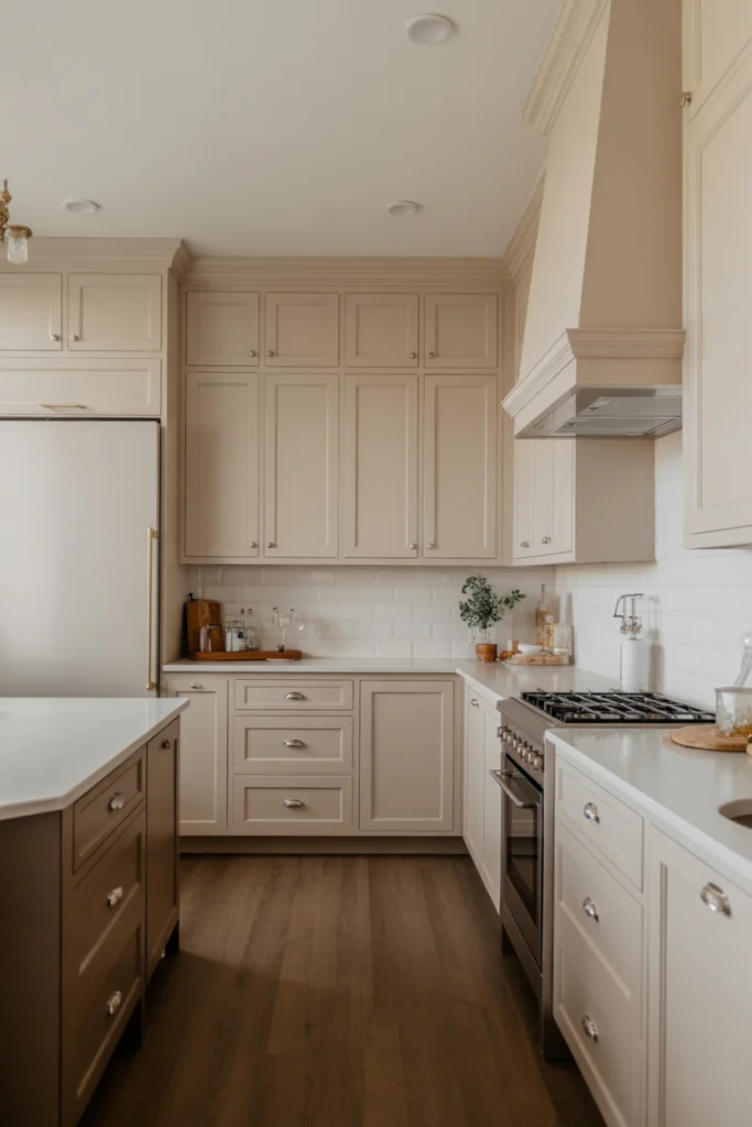 Transitional kitchens bridge traditional elegance with modern simplicity. This style blends contemporary cabinetry with classic detailing, offering harmony between different eras. Neutral palettes such as beige, gray, and taupe help create a cohesive look. Quartz countertops, paneled appliances, and soft lighting enhance the sophistication.