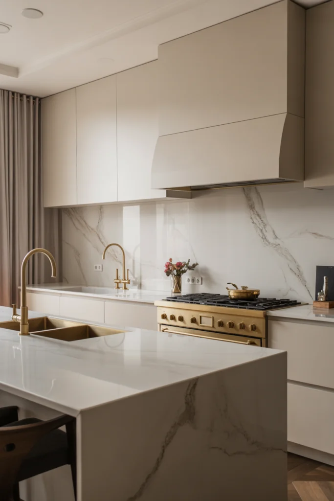 Marble kitchens embody elegance and high-end design. Marble islands, countertops, and backsplashes create a luxurious visual impact. The natural veining adds depth and unique character to the space. Polished metals such as brass or chrome pair beautifully with marble surfaces.