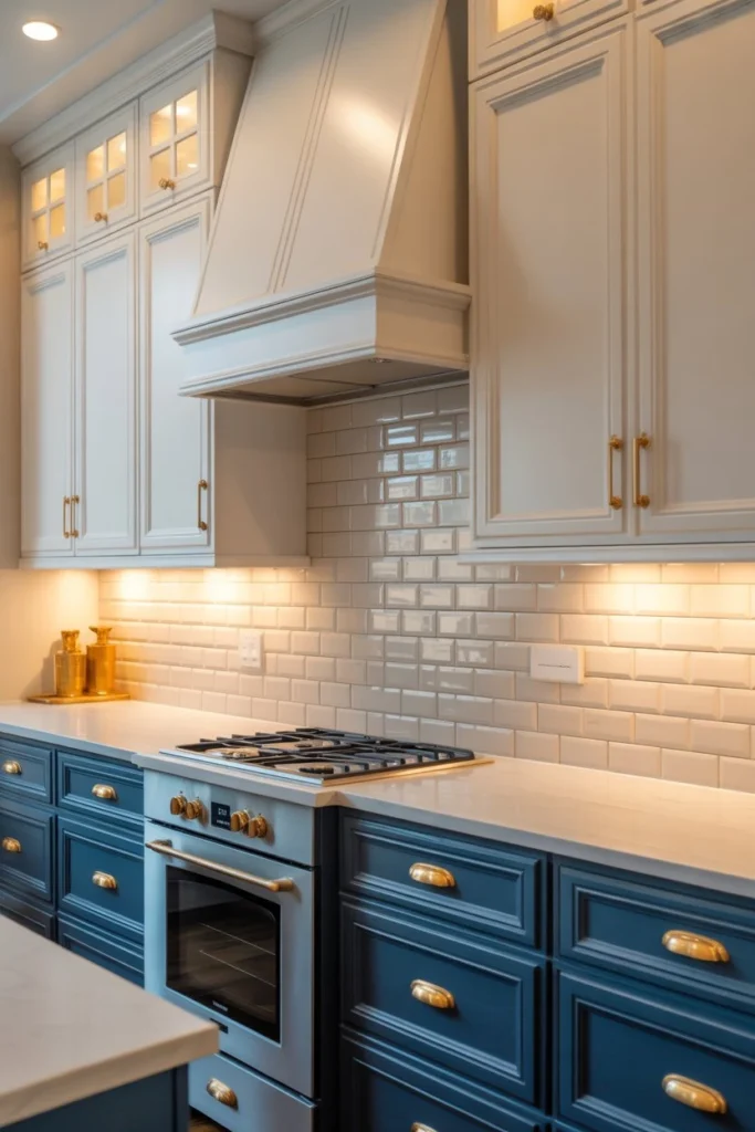 Two-tone cabinetry adds depth and interest to the kitchen. Popular combinations include white with navy, gray with wood, or black with gold accents. The contrasting colors break up monotony and help define different zones in the kitchen.