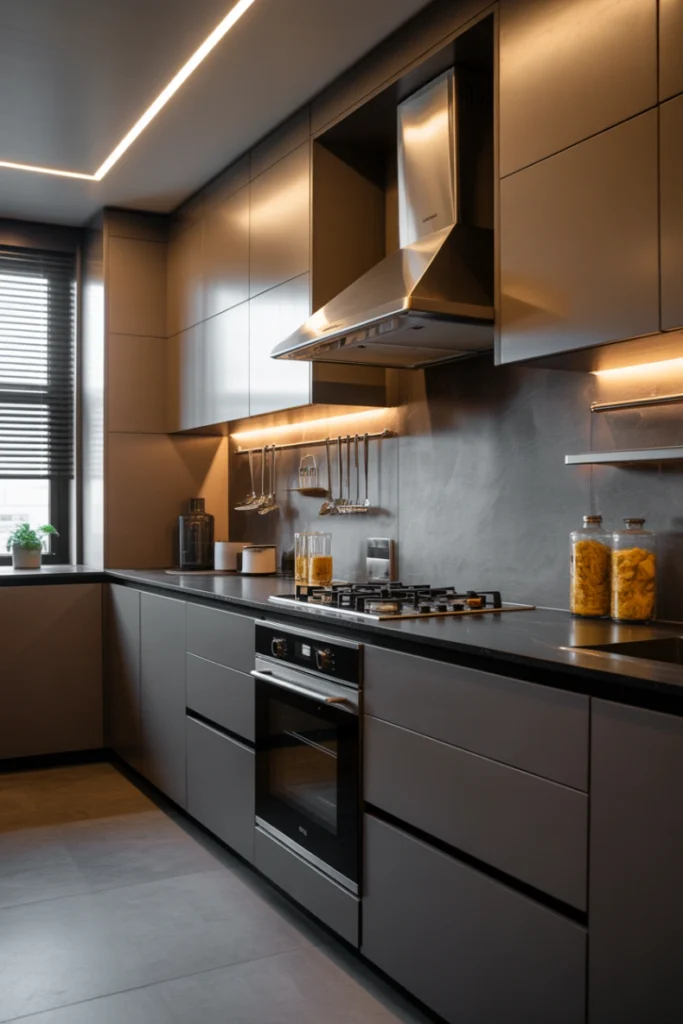Small kitchens require smart planning. Innovative storage such as pull-out racks, vertical shelving, and hidden drawers maximize space. Light colors, mirrors, and glass cabinetry help the kitchen feel larger. Compact appliances also play a role in maintaining efficiency.