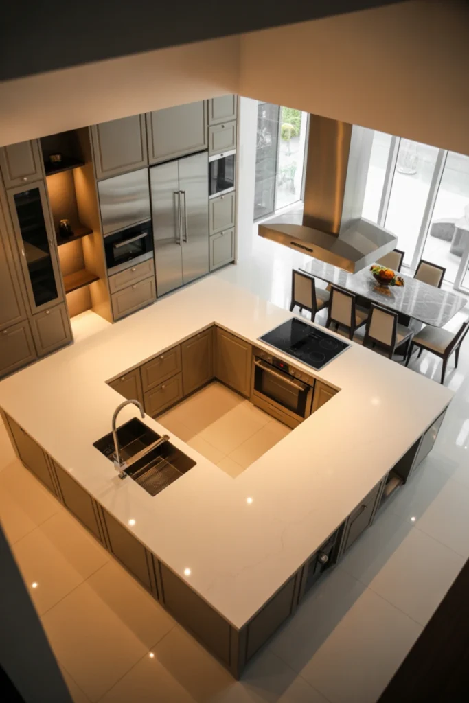 The design helps separate cooking, cleaning, and preparation areas. These House Kitchen Ideas work well for homeowners seeking structure and functionality.