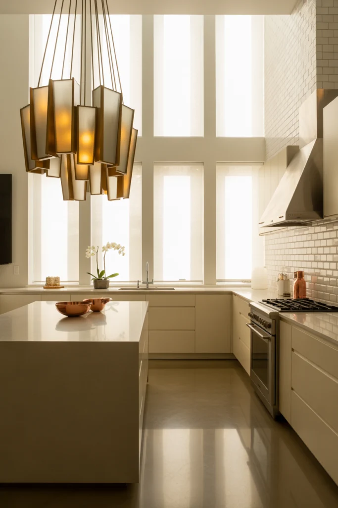 Lighting can completely transform a kitchen. Statement chandeliers, oversized pendants, or sculptural fixtures create a focal point. Good lighting improves functionality and elevates the mood.