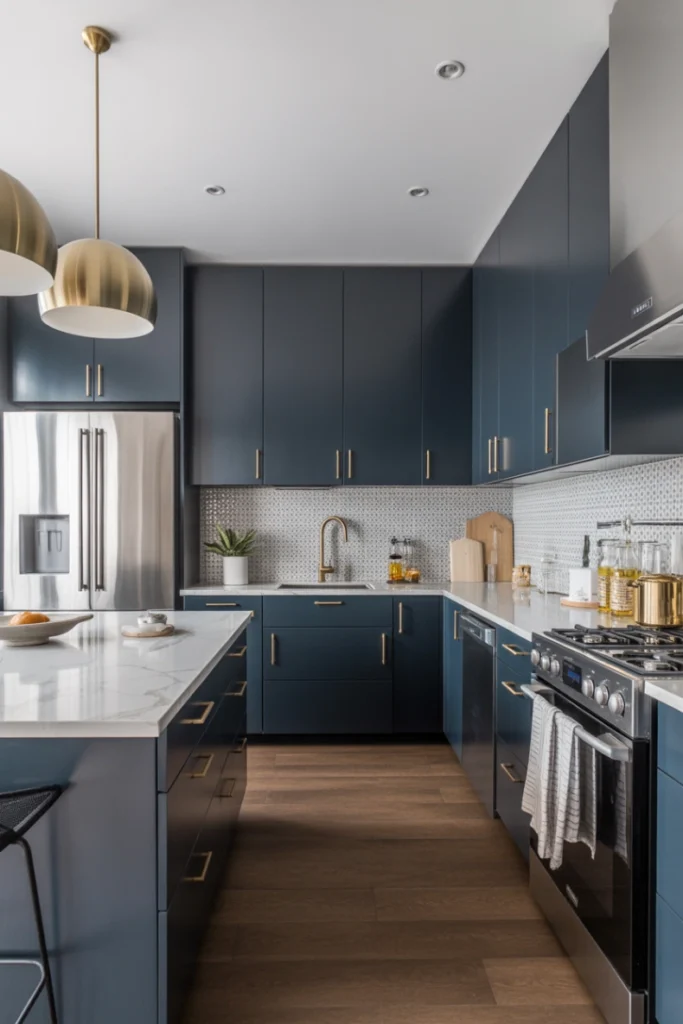 Contemporary kitchens are known for their dynamic design elements, mixing modern materials with striking accents. This style often includes bold color choices, geometric shapes, and innovative lighting. High-gloss finishes, stainless-steel appliances, and polished stone surfaces give the kitchen a sleek look. Integrating vibrant colors such as navy, emerald green, or matte black can add a unique flair without overwhelming the space.