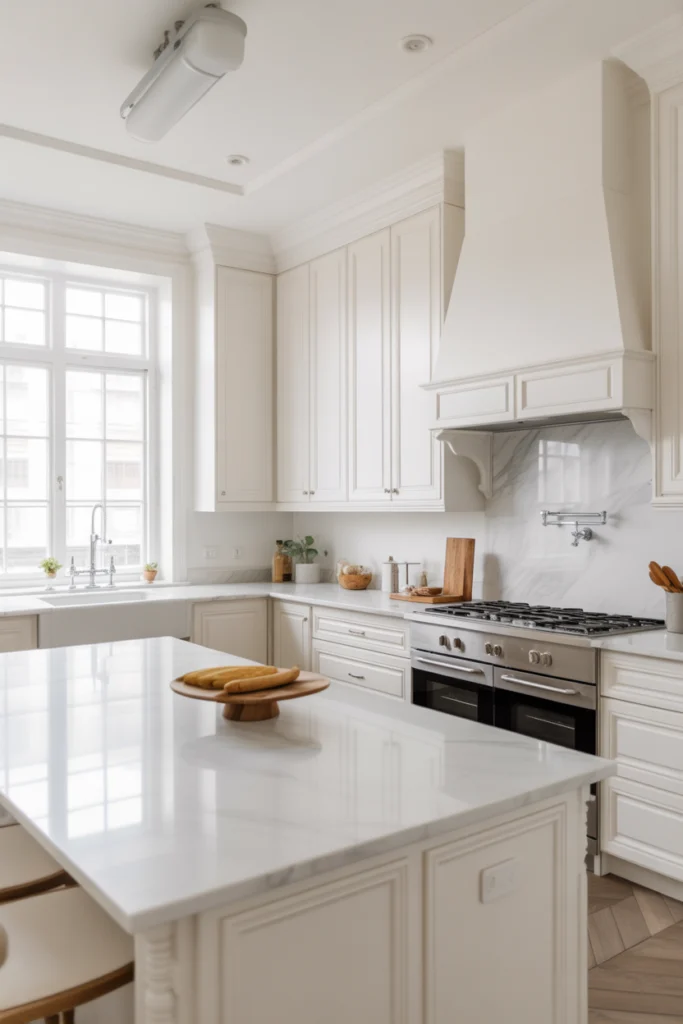To avoid a sterile feel, adding texture is key. Textured backsplashes, paneled cabinetry, and a combination of matte and glossy finishes help create visual depth. Wooden floors or warm-toned bar stools can bring balance to the design. Among House Kitchen Ideas, an all-white luxury kitchen remains one of the most popular choices for new homes and renovations alike.