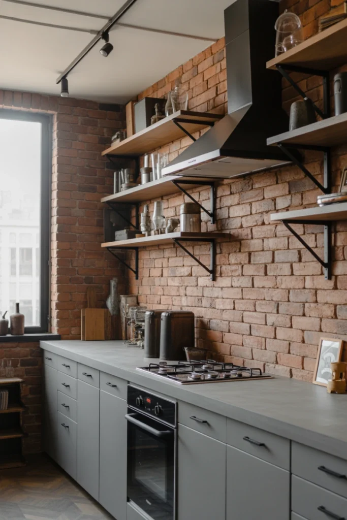 Industrial-style kitchens are inspired by loft living and warehouse aesthetics. They often feature raw materials such as exposed brick, concrete countertops, black steel frames, and open shelving. Metal pendant lights, rugged textures, and reclaimed wood elements complement the industrial look. This design embraces imperfections, making every material and finish feel intentional and stylish.