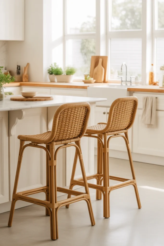 Rattan or woven stools introduce texture and natural warmth into the kitchen. This kitchen stool idea is perfect for bohemian, coastal, or casual interiors.