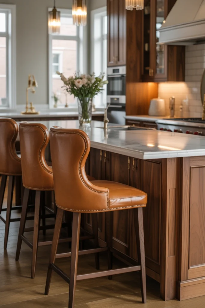 Leather stools bring sophistication and durability to kitchen seating. This kitchen stool idea works well in modern and upscale interiors.