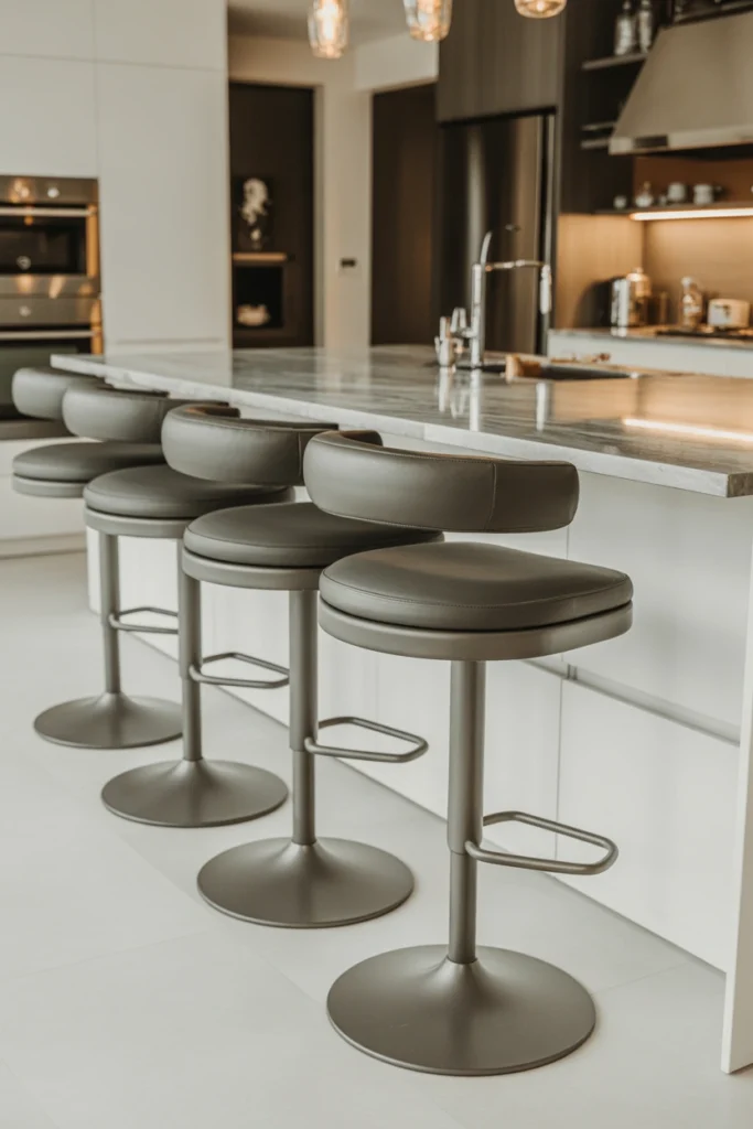 Swivel stools add flexibility and convenience to kitchen seating. This kitchen stool idea allows users to rotate easily, making it simple to move in and out without pushing the stool back. Swivel designs are particularly practical in busy kitchens.