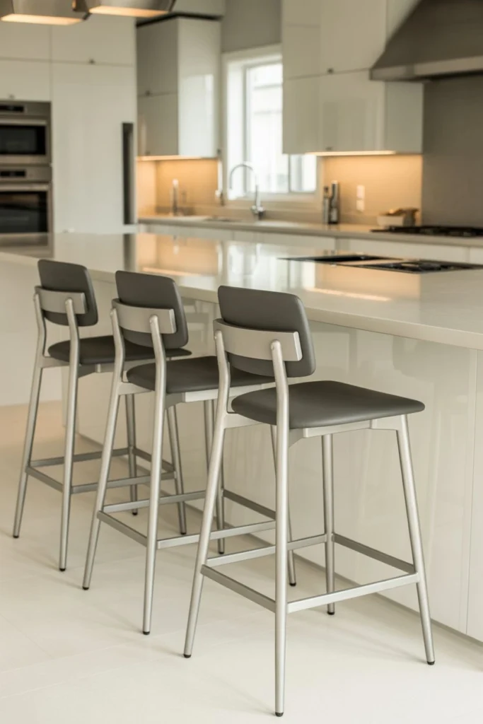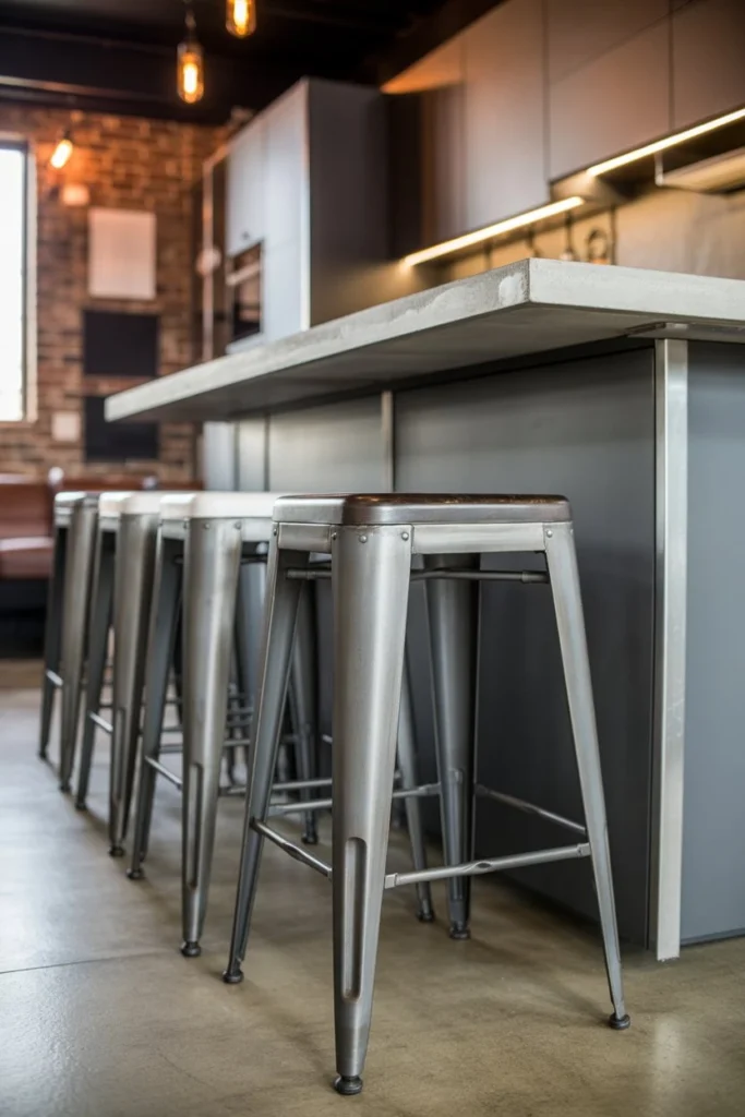 Metal kitchen stools introduce an industrial or contemporary edge to the kitchen. This kitchen stool idea works especially well in modern, urban, or loft-style homes. Their sleek lines and metallic finishes create a bold visual contrast against wood or stone surfaces.