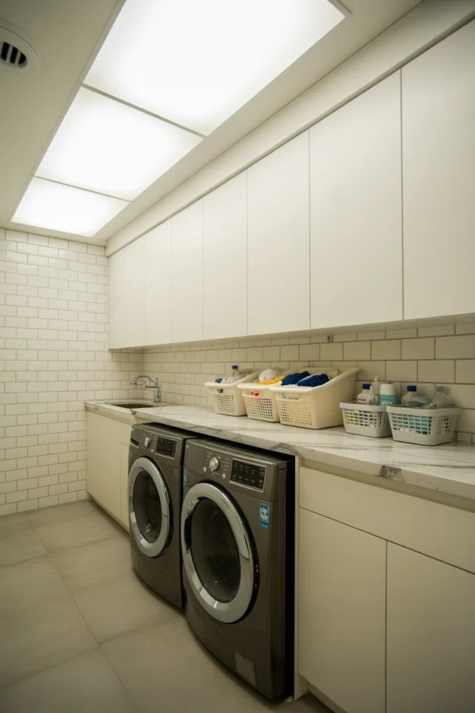 Proper lighting is a critical yet underestimated aspect of laundry room ideas. Bright, even lighting improves visibility for sorting, folding, and stain treatment tasks. Overhead LED lights or recessed lighting ensure the entire room is well-lit without harsh shadows.