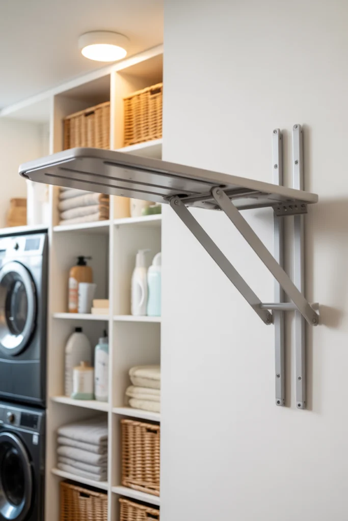 A compact ironing station is an excellent addition to functional laundry room ideas. Wall-mounted or fold-down ironing boards save space while providing a convenient area for garment care. This eliminates the need to store bulky boards elsewhere in the home.
