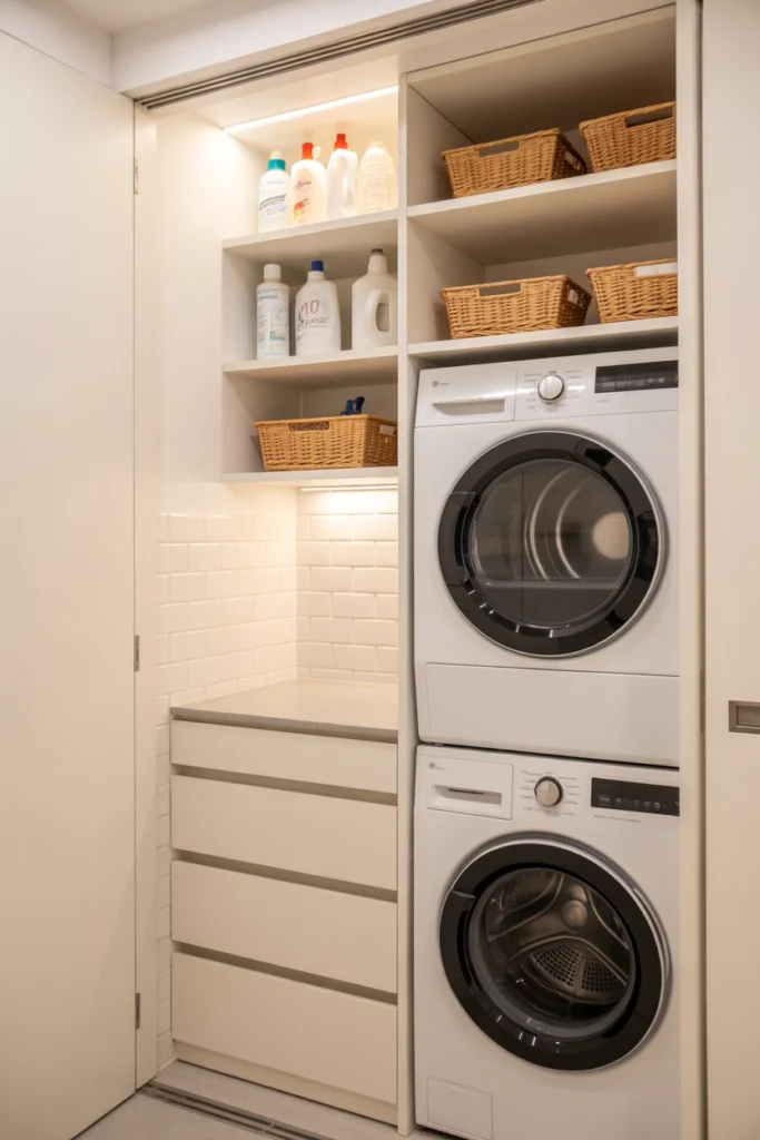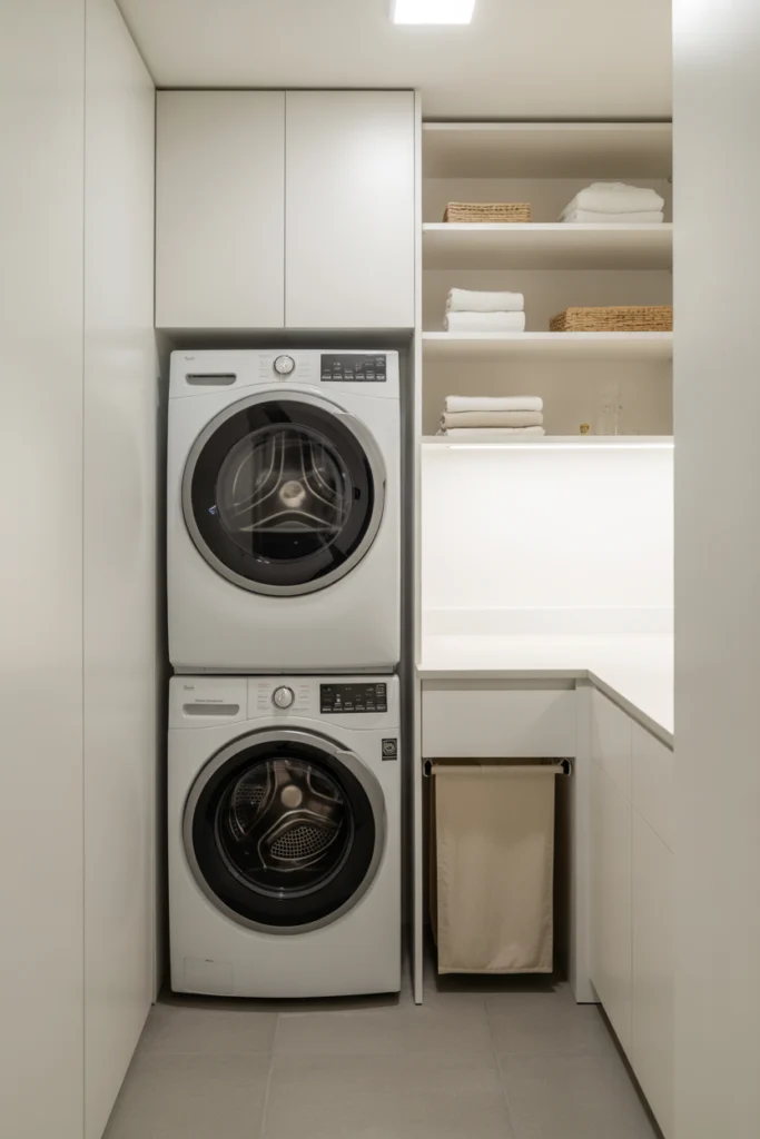 Stackable appliances are a classic yet essential solution among laundry room ideas for small homes and apartments. By stacking the washer and dryer vertically, you free up valuable floor space that can be used for storage, folding areas, or walkways. This layout works especially well in narrow rooms, closets, or hallway laundry setups.