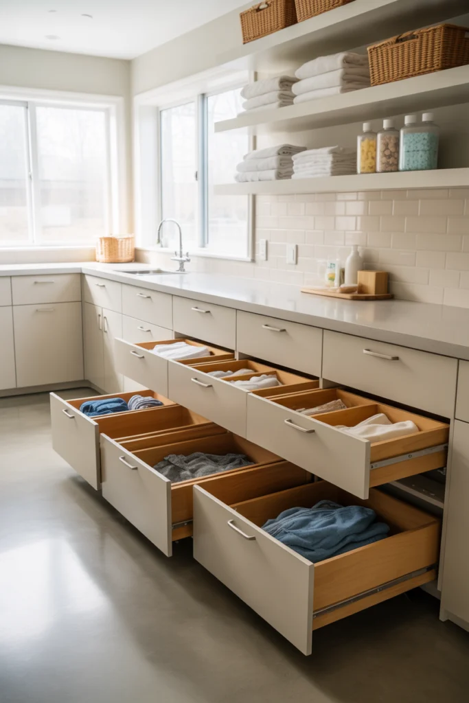 Multiple pull-out bins can be labeled for easy identification, making laundry routines faster and more efficient. This idea is especially useful for families, as it encourages organization and helps everyone participate in maintaining an orderly laundry space.