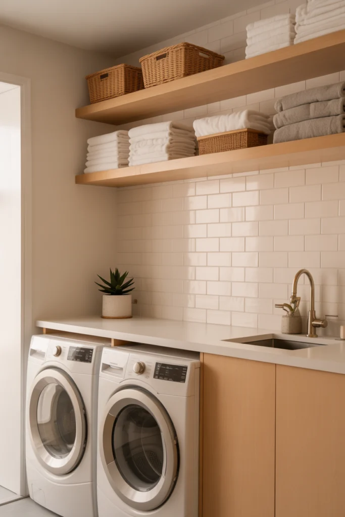 Open shelving remains one of the most popular laundry room ideas for both small and large spaces. It allows quick access to frequently used items such as detergent, fabric softener, and baskets while keeping the room visually open. Shelves can be installed above appliances or along unused walls to maximize storage.