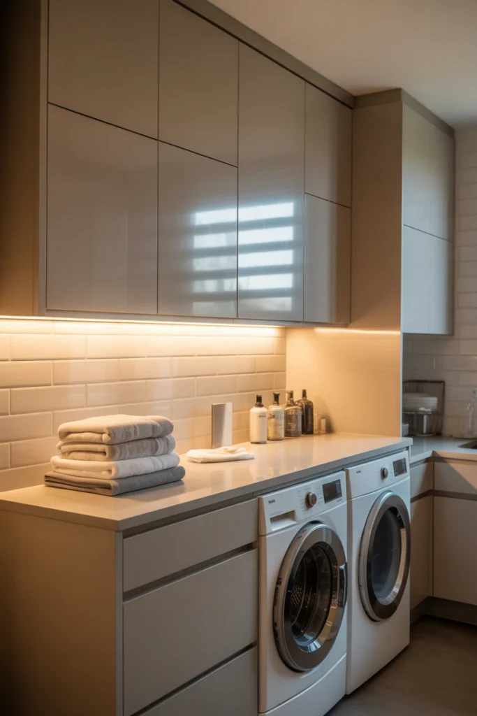 Under-cabinet lighting enhances visibility in key work areas. These laundry room ideas improve task efficiency while adding subtle ambiance. LED strips are energy-efficient and easy to install.