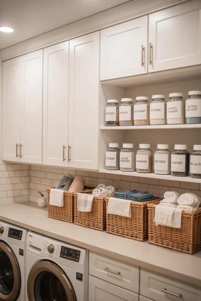 Clear or labeled containers also help track inventory and prevent overbuying. This approach enhances both functionality and aesthetics, making the laundry room feel intentional and well-designed.