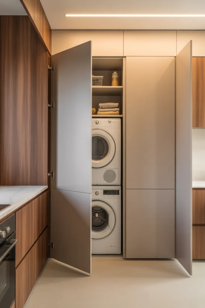 Hidden laundry rooms are especially useful in apartments or smaller homes. When not in use, the space appears tidy and cohesive with the surrounding design. With proper ventilation and thoughtful layout planning, concealed laundry areas offer full functionality without sacrificing aesthetics.