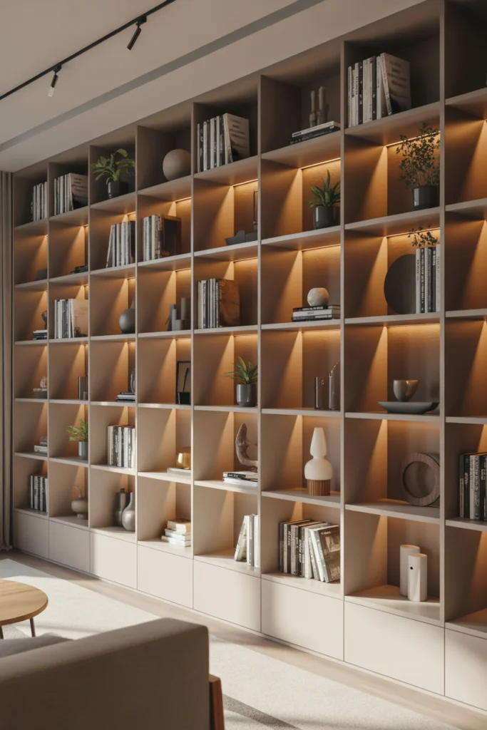 Customize your shelves with LED strip lighting, glass panels, or floating niches for a modern aesthetic. Built-ins create an upscale appearance and help maintain a clean, clutter-free living room layout.