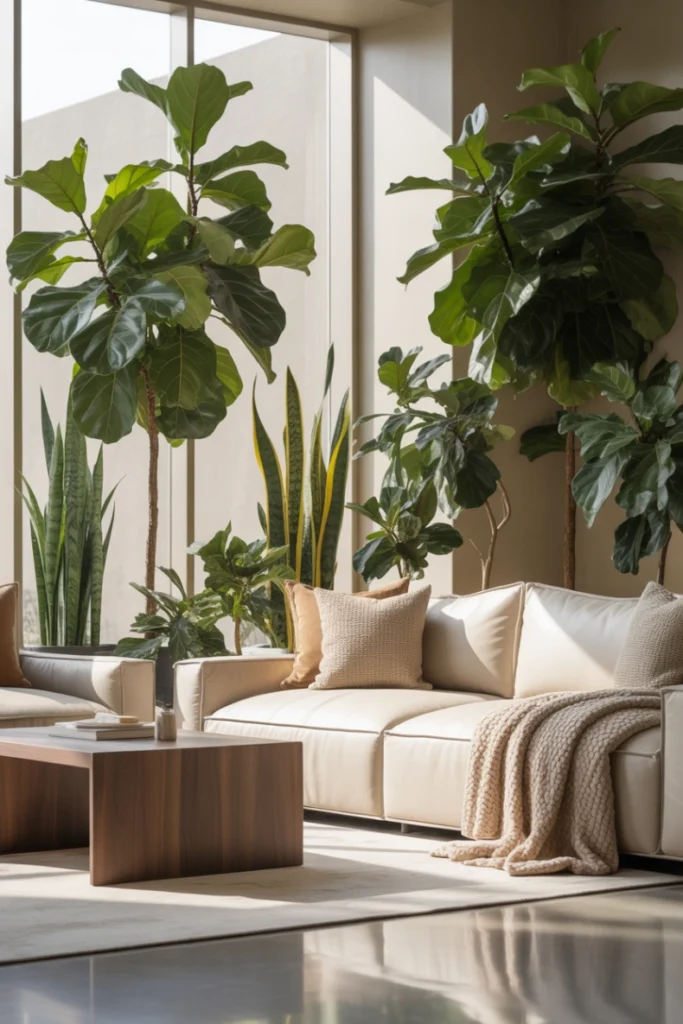 Plants soften and brighten your living room. Large indoor plants like fiddle leaf figs, monstera, or snake plants add height and greenery. Smaller plants on shelves or coffee tables bring texture and life to the room. Nature-inspired décor supports relaxation and improves air quality while enhancing visual appeal.