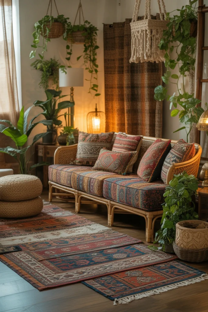 Bohemian style embraces creativity and relaxed elegance. Layered rugs, patterned pillows, woven baskets, and eclectic décor define this carefree aesthetic. Use warm earthy tones mixed with vibrant accents to bring character and charm. Bohemian interiors offer personality and warmth.