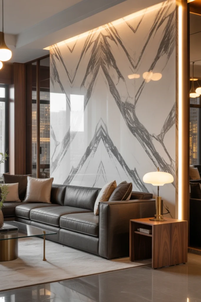 Marble instantly enhances sophistication. Whether used on the coffee table, fireplace wall, or shelving details, marble elevates your living room with a premium aesthetic. White, black, green, and brown marbles each offer unique visual impact. Combine marble with warm lighting to highlight its natural veining.
