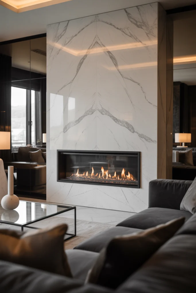 Fireplaces act as a striking focal point. Modern electric or gas fireplaces offer convenience while enhancing ambiance with warm lighting effects. Pair them with stone, marble, or textured wall finishes for a luxurious appearance. Fireplaces create a cozy environment ideal for cold seasons or evening relaxation.