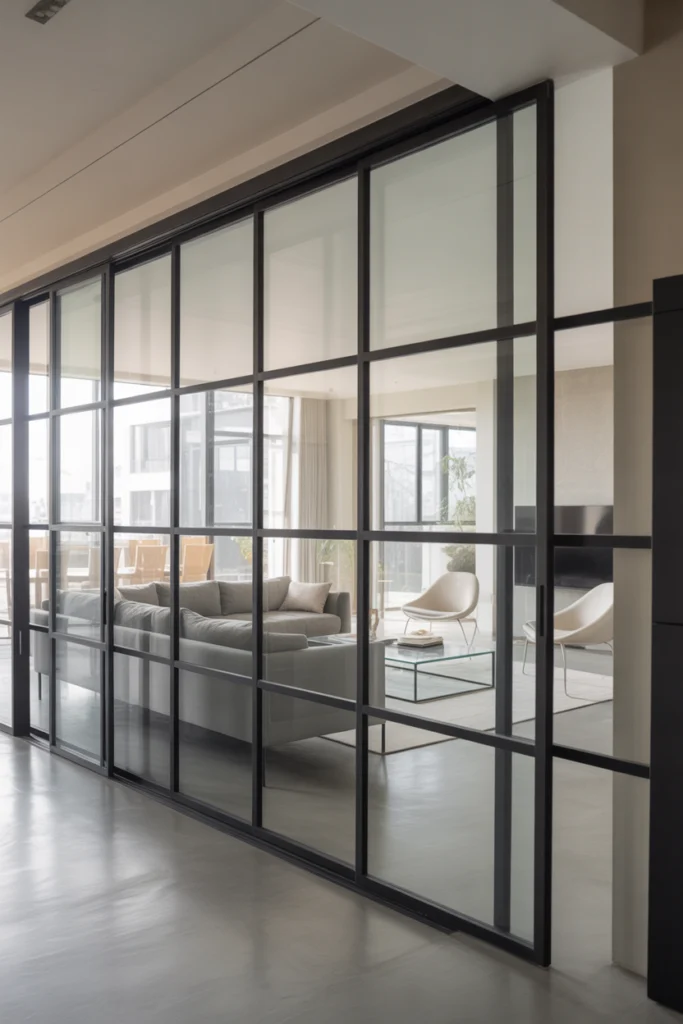 Glass partitions maintain openness while subtly dividing space. They bring light into every corner, making living rooms feel spacious and luxurious. Black-framed or frameless glass enhances modern and industrial aesthetics.