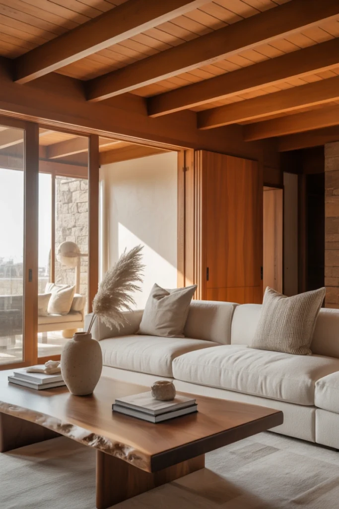 Wood adds warmth and texture to living room interiors. Whether used in the flooring, coffee table, shelving, or accents, wood creates a cozy and organic atmosphere. Light oak, walnut, or ash wood brings natural elegance to your space.