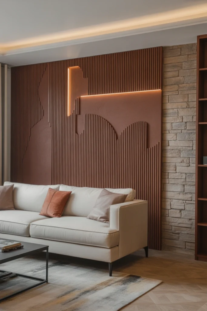 A bold accent wall can instantly elevate your living room’s personality. Textured materials such as stone cladding, fluted wood panels, exposed brick, or Venetian plaster add a dramatic focal point that enhances depth and visual interest. Whether behind the sofa or across the media wall, textured accent walls bring a luxurious and architectural feel to the room. They complement modern, industrial, and contemporary aesthetics flawlessly.