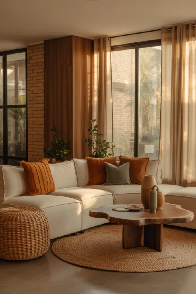 To avoid monotony, layer contrasting textures such as stone accents, woven rugs, and knitted throws. Earthy colors make your living room feel tranquil and timeless, fitting effortlessly into both modern and traditional homes.