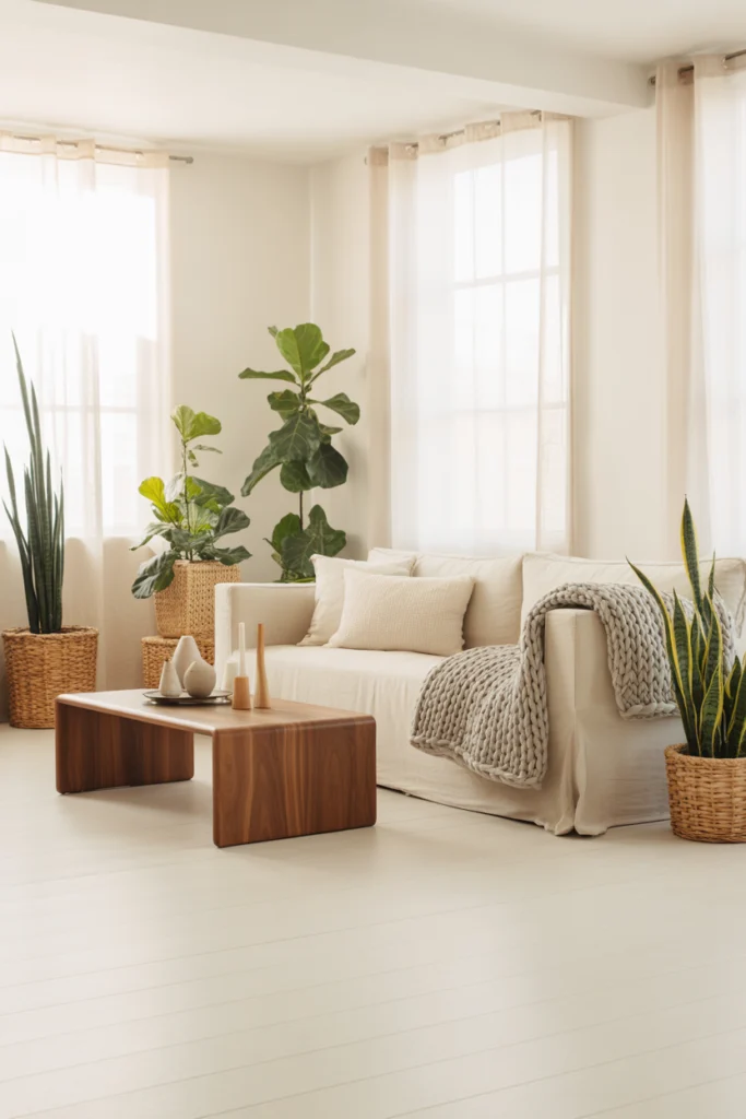 Soft textures like wool blankets, cotton cushions, and layered rugs make the space feel warm and inviting. Indoor plants add freshness and color, enhancing the peaceful atmosphere. This remodel approach emphasizes natural lighting, so choosing sheer curtains or unobstructed windows helps amplify brightness. The result is a harmonious living room that feels cozy, stylish, and highly livable.