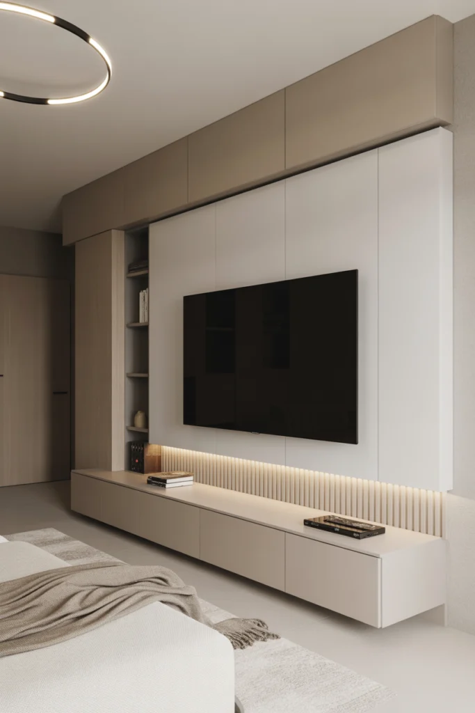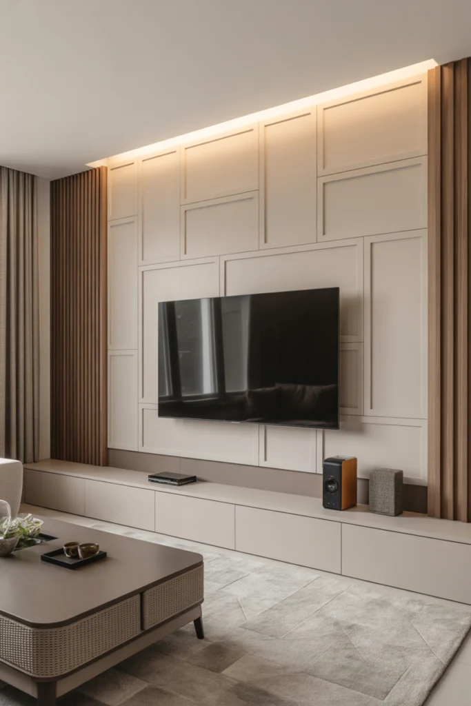 Functionality is just as important as aesthetics in minimalist living room TV wall ideas. Concealed cable management, built-in storage, and smart lighting help maintain a polished look. Soft LED backlighting can enhance viewing comfort while adding depth to the wall. This design works especially well in contemporary apartments and homes where simplicity and elegance are priorities.