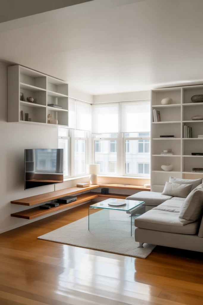 A corner TV wall is a smart solution for small or uniquely shaped living rooms. Positioning the TV in a corner maximizes wall space while maintaining comfortable viewing angles. Custom corner units or angled mounts ensure the setup looks intentional and well-designed.