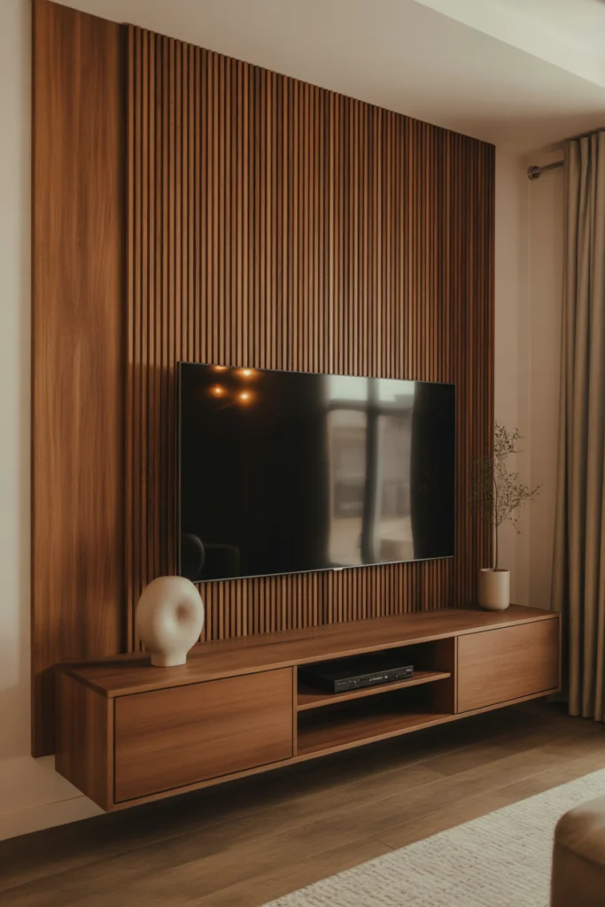 Beyond aesthetics, wood panel living room TV wall ideas can improve acoustics and create a cozy atmosphere. Pairing wood panels with a floating shelf or low-profile console provides practical storage without detracting from the design. Proper spacing and alignment ensure the TV remains the focal point while the wood panels enhance the overall ambiance.