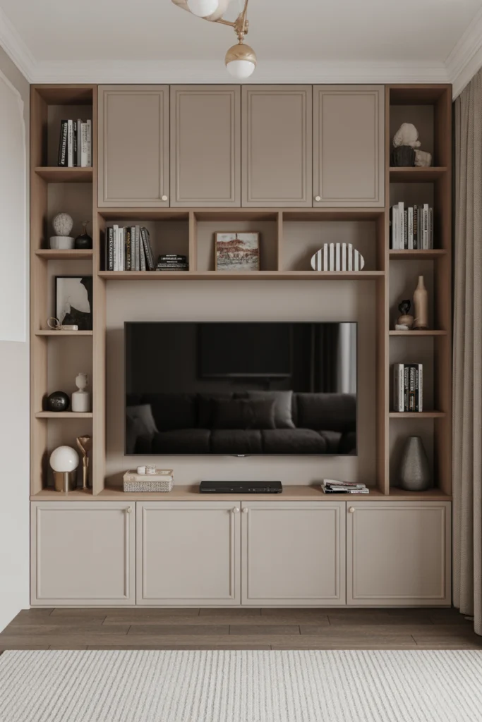 From a functional standpoint, built-in living room TV wall ideas help hide cables, speakers, and gaming systems. You can mix open shelves with closed cabinets to showcase décor while concealing clutter. Choosing finishes that match your furniture ensures the TV wall feels like a natural extension of the living room rather than an add-on.