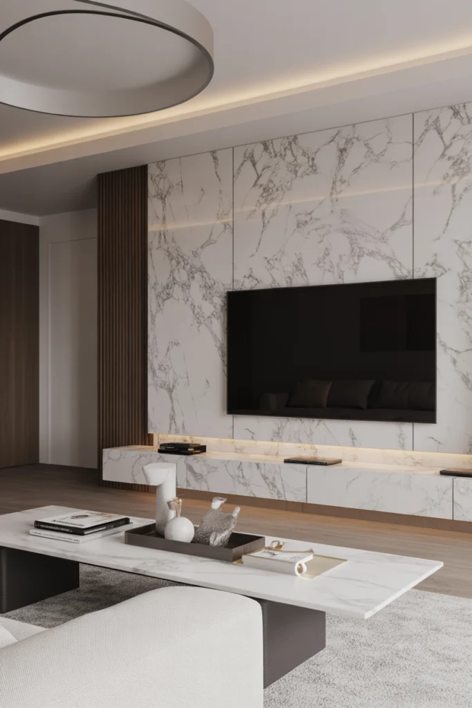 A marble or stone TV wall brings luxury and sophistication to the living room. Natural stone surfaces, whether real or high-quality slabs, create a dramatic backdrop for the television. The veining patterns add depth and character, making the TV wall feel like a statement feature rather than a functional necessity.