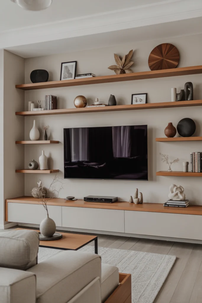 Floating shelves around the TV create a balanced mix of style and flexibility. This design allows you to personalize your TV wall with books, plants, artwork, and decorative objects. Floating shelves work well in both small and large living rooms, offering visual interest without making the space feel heavy.