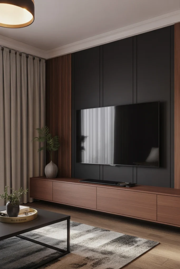 A dark accent TV wall creates a bold, cinematic atmosphere in the living room. Deep shades like charcoal, navy, or matte black reduce screen glare and help the TV blend seamlessly into the wall when turned off. This approach is popular in modern and industrial interiors where contrast plays a key role.