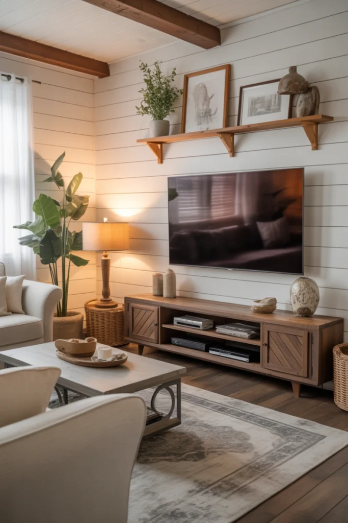 Practical farmhouse living room TV wall ideas often include built-in shelves or a rustic media console for storage. Mixing textures like wood, metal, and soft textiles enhances visual interest. The result is a TV wall that feels cozy, functional, and timeless.