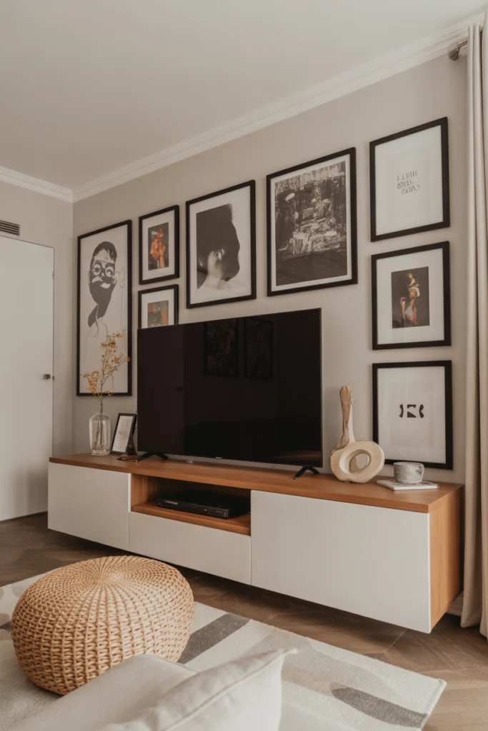 An artistic gallery TV wall turns the television into part of a curated display. Surrounding the TV with framed artwork, photographs, or prints helps it blend into the décor rather than stand out. This approach is ideal for creative homeowners who want a personalized and expressive living room.