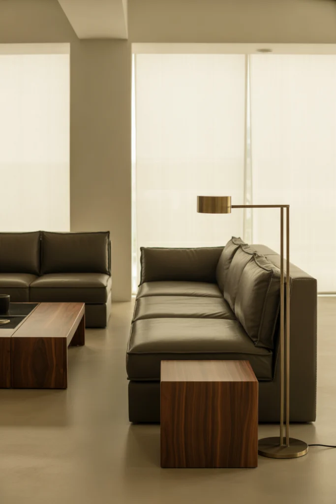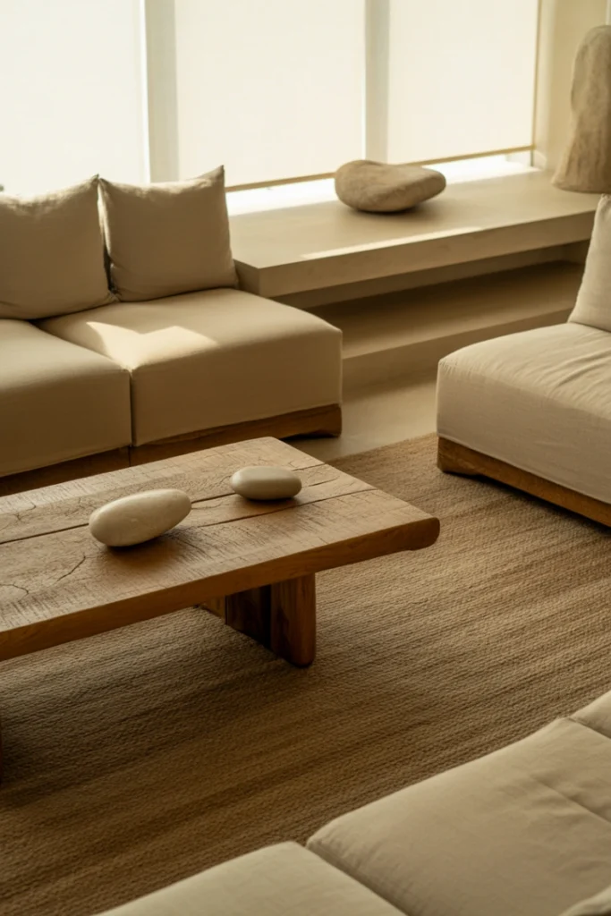 Low-profile furniture helps create a grounded and calm atmosphere. Sofas with low backs, simple coffee tables, and minimal shelving keep the room feeling open. This style works especially well in small spaces where tall furniture can make the room feel crowded.