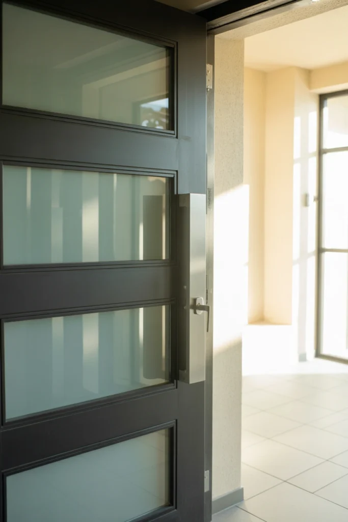 Upgrade your front door to a modern design with clean lines and premium materials. Frosted glass panels or matte finishes elevate the entire entryway instantly.