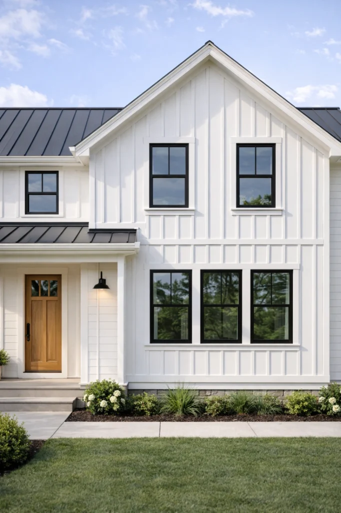 Beyond aesthetics, board-and-batten siding is durable and versatile. It pairs beautifully with black window frames, wood accents, and metal roofs. Homeowners love this option because it reflects light, keeps the home looking fresh, and serves as a neutral canvas for landscaping and architectural details.