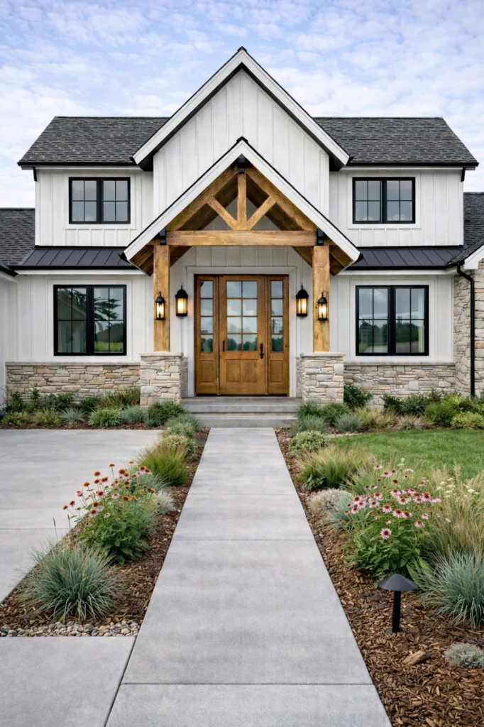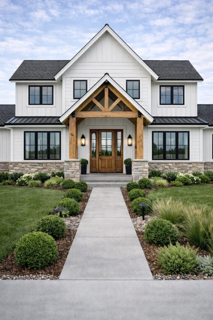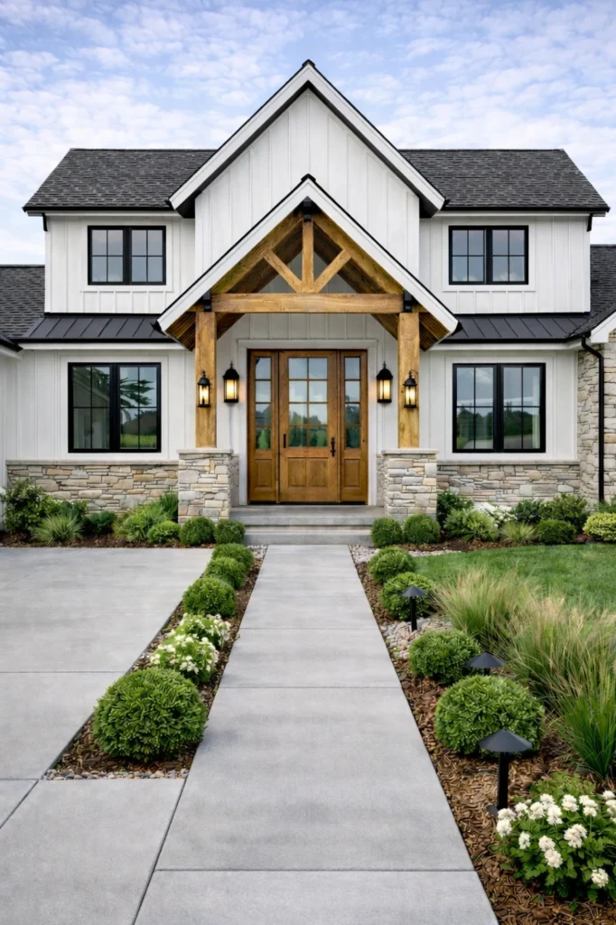 Natural wood accents bring warmth and texture to modern farmhouse exterior ideas. Whether used on entry doors, porch beams, or shutters, wood softens the crisp lines of modern design. It adds a handcrafted feel that connects the home to nature.