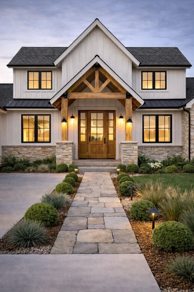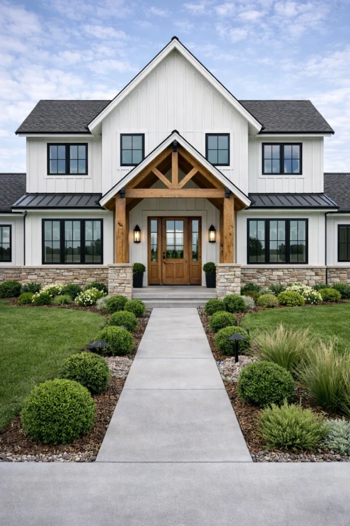 White board-and-batten siding is a defining feature of modern farmhouse exterior ideas. The vertical lines create visual height, making homes appear taller and more elegant. This siding style combines old-world barn aesthetics with modern simplicity, giving the exterior a clean and structured look that works well in both rural and suburban settings.