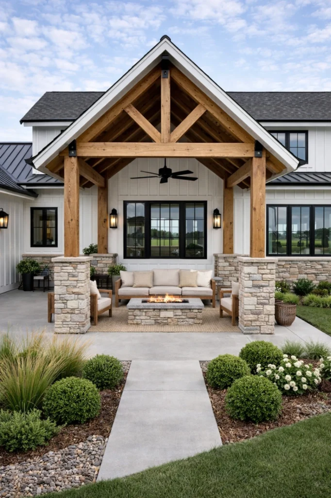 Covered patios and outdoor living areas extend the farmhouse lifestyle outdoors. These spaces are essential in modern farmhouse exterior ideas because they encourage connection with nature and provide functional gathering areas.
