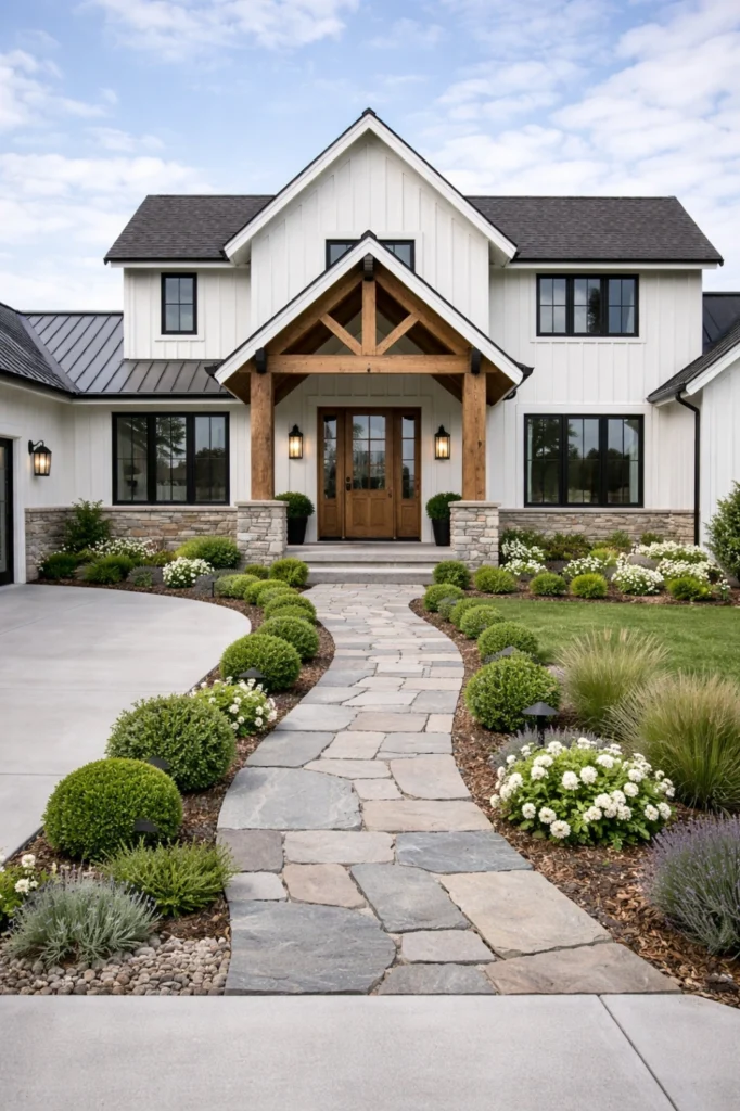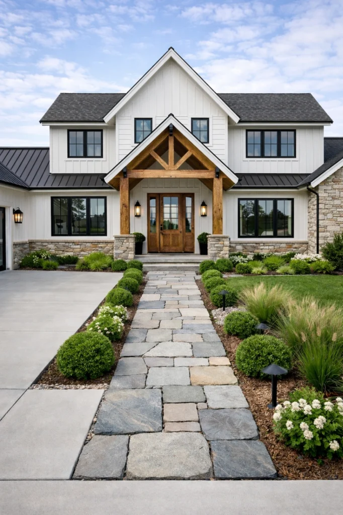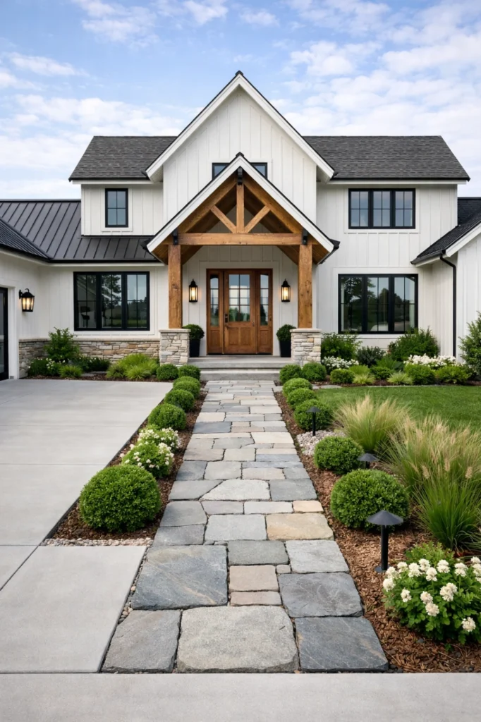 Driveways and walkways are often overlooked but play a key role in modern farmhouse exterior ideas. Clean, simple materials like concrete, gravel, or stone pavers complement the architecture without distraction.
