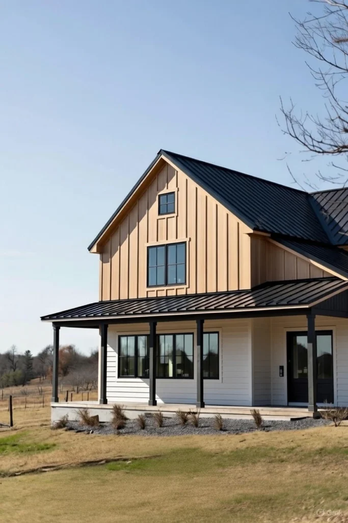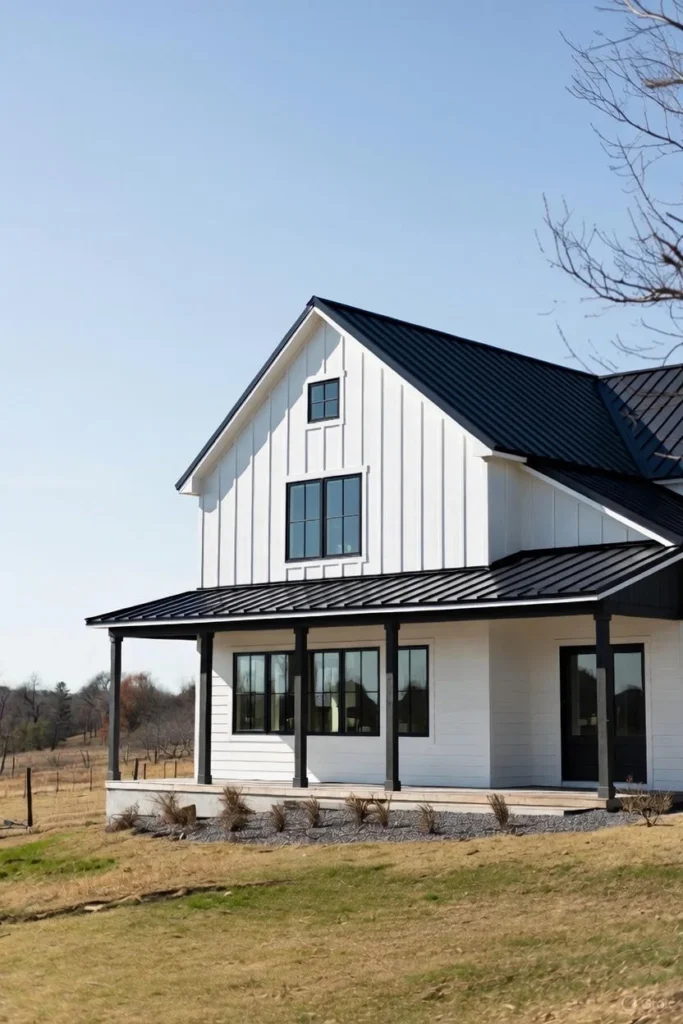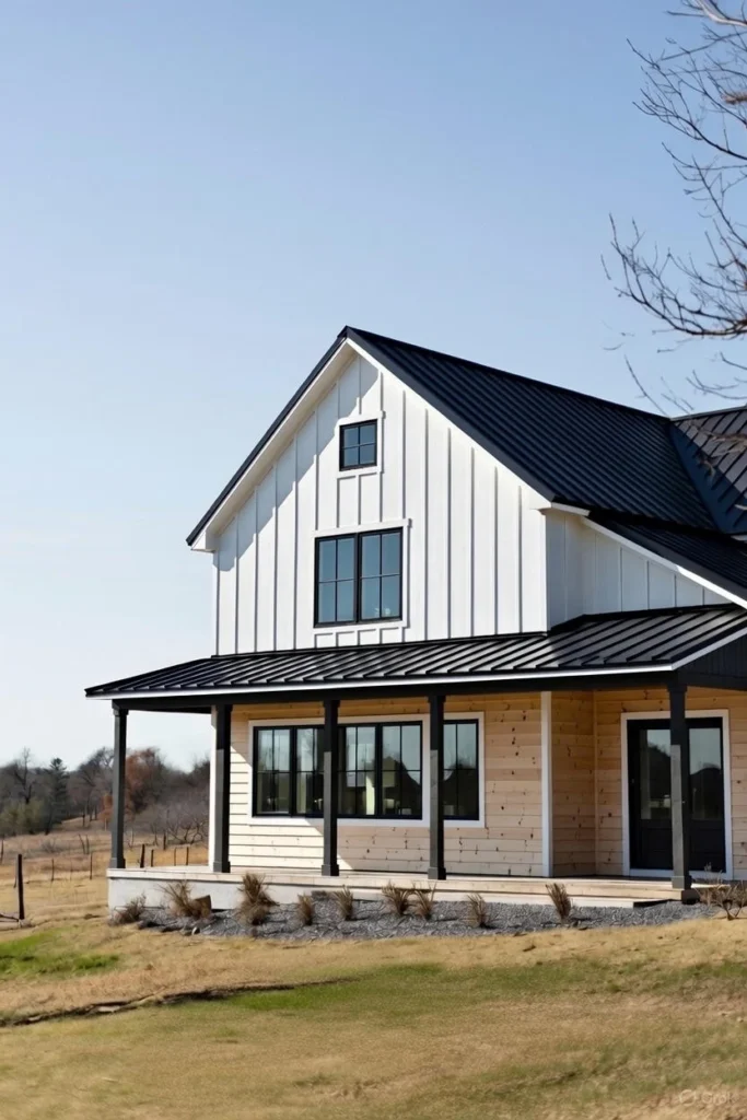 Metal roofing is both practical and visually iconic in modern farmhouse exterior ideas. Its sleek appearance adds a contemporary feel while referencing traditional agricultural buildings. Available in finishes like matte black, charcoal, or galvanized steel, metal roofs enhance the home’s clean lines.