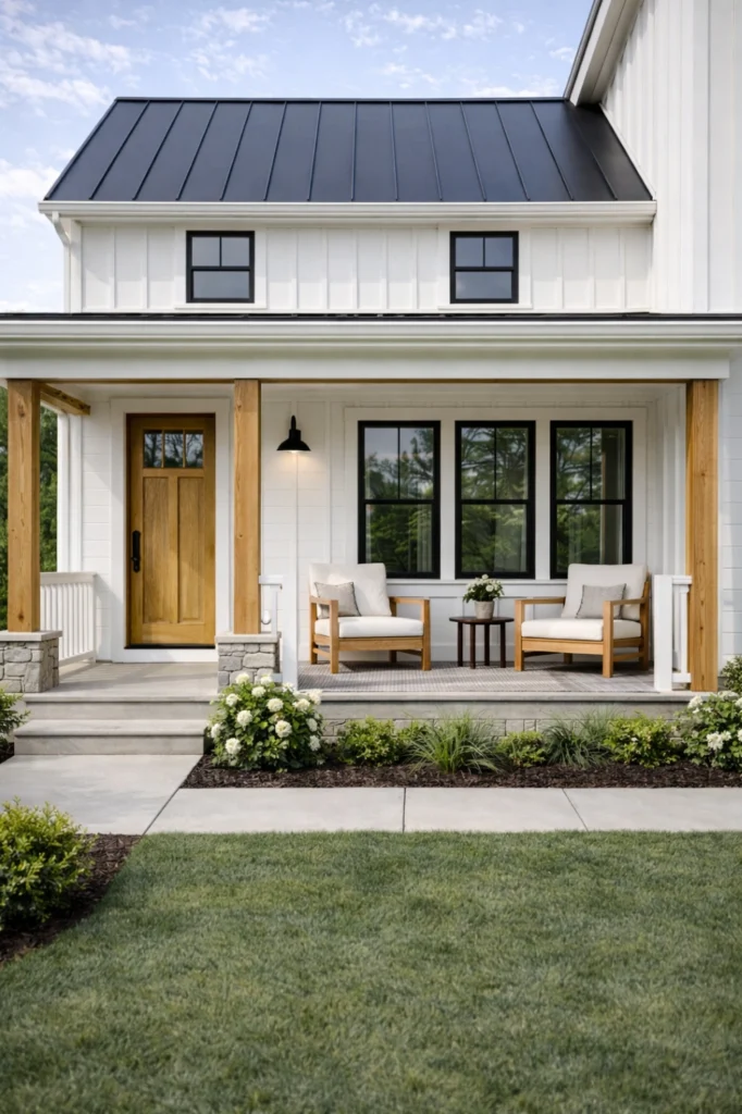 Wood accents work especially well when left in natural tones or lightly stained. They contrast beautifully with white siding and black trim. Over time, wood develops character, making the exterior feel more inviting and lived-in while maintaining its modern appeal.
